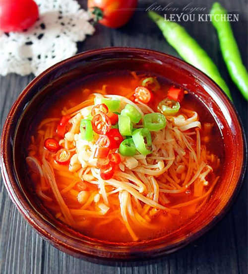 6、将金针菇放入锅内煮开后开始调味,加入盐、糖、鸡精;