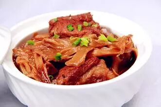 3、倒入1勺料酒、3-4勺生抽、葱姜段儿、大料,加入适量水没过排骨,用大火烧开; 4、烧开后,转乘中火炖约5分钟,放入泡好的灰树花,再倒入泡灰树花的水,用中火炖制约10分钟,或者汤汁收浓即可,出锅前加入1勺鸡精提味。
