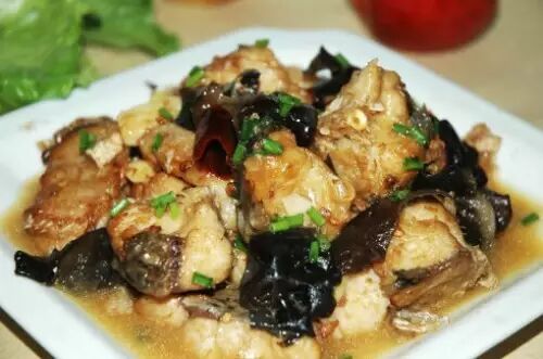 4)炒锅上大火,留底油烧热,下葱末、姜末炝锅,放入鱼片,再下黑木耳、黄酒,快速煸炒片刻,加鲜汤烧沸,用湿淀粉勾薄芡,加精盐、味精,颠翻几下,撒胡椒粉,起锅装盘即成。