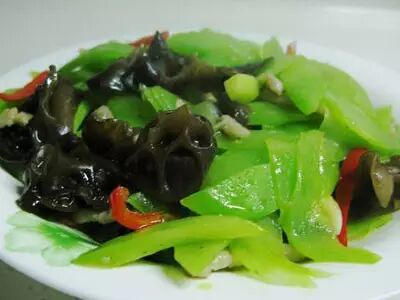 食材:葛笋500克,黑木耳(干)50克,大蒜(白皮)5克,大葱5克,姜、泡椒、味精、盐、香油、植物油各适量。